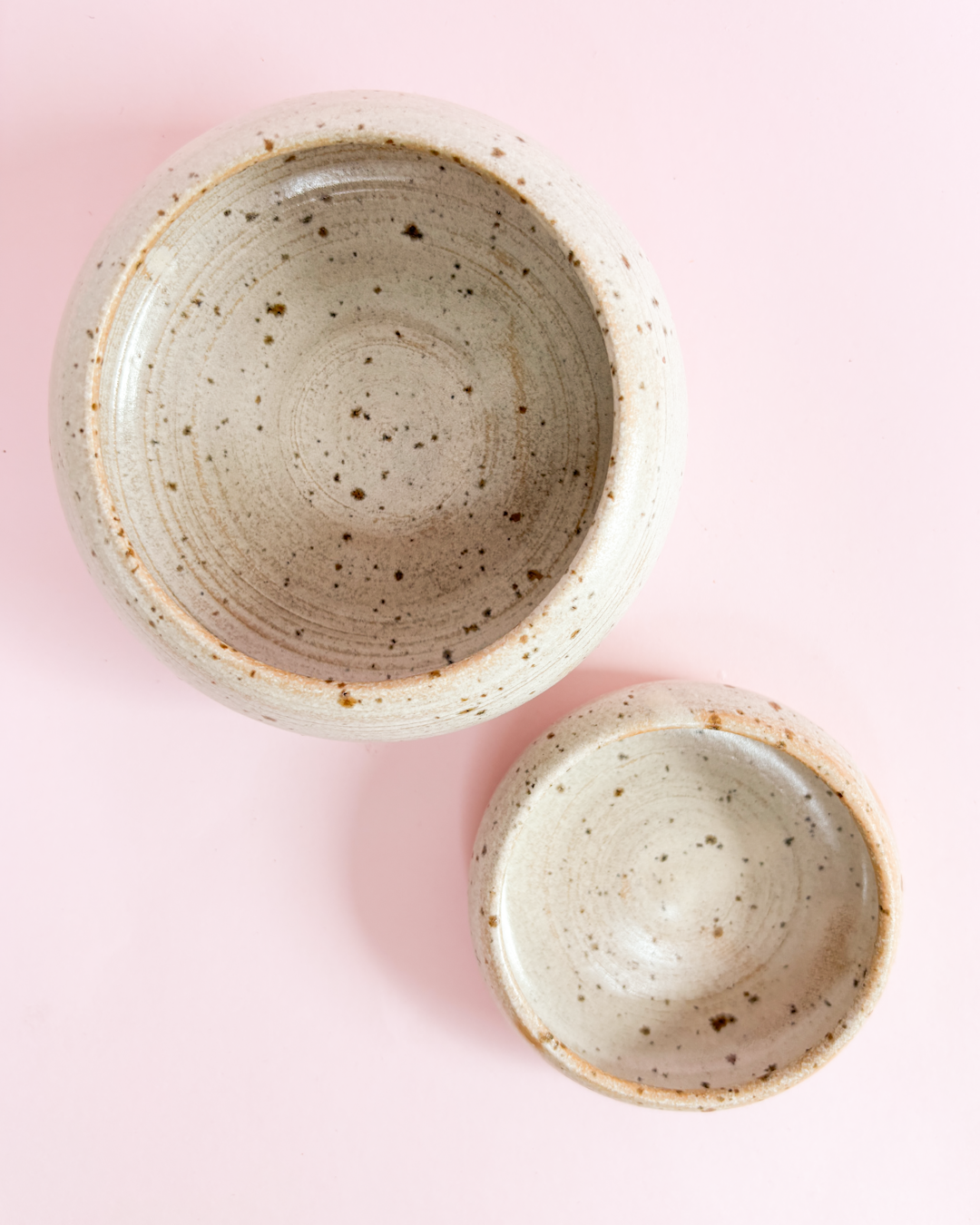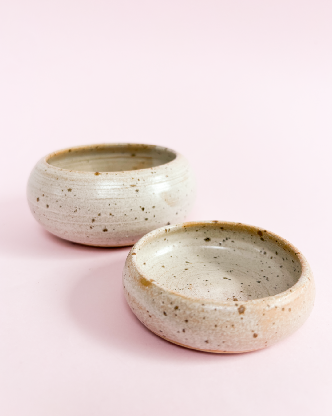 Hånddrejede skåle af stentøjsler med cremefarvet glasur og lavapletter